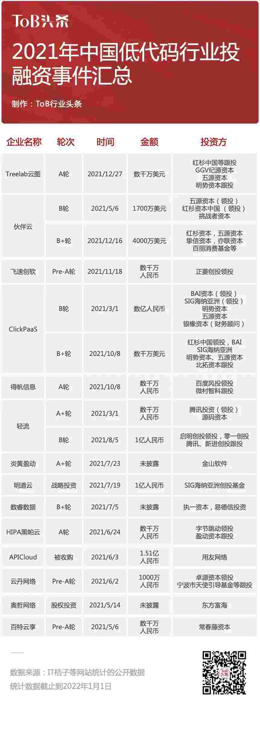到2021年,,,,无/低代码投融资规模势头更甚,,其中包括轻流两轮融资(A+轮数千万人民币,,,,B轮近亿人民币)、、、小米钱包 两轮融资(B轮数亿人民币,,,,B+轮数千万美元)、、、百特云享数千万元Pre-A轮融资......